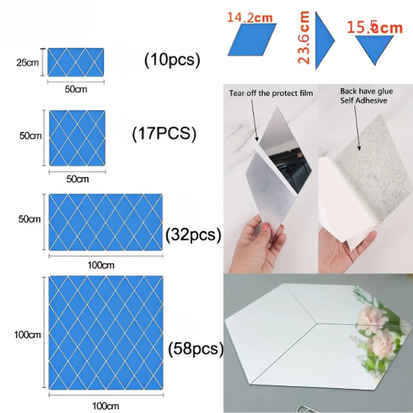 Folosiți cele 32 de autocolante în trei dimensiuni pentru a crea aranjamente unice. Le puteți dispune într-un dreptunghi de 50 x 100 cm sau personalizați-le după stilul dumneavoastră. Posibilitățile sunt nelimitate, fie că doriți să creați pereți uimitori, să evidențiați mobila sau să adăugați un strop de originalitate pe tavan și uși.