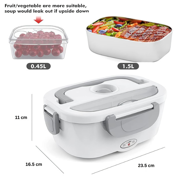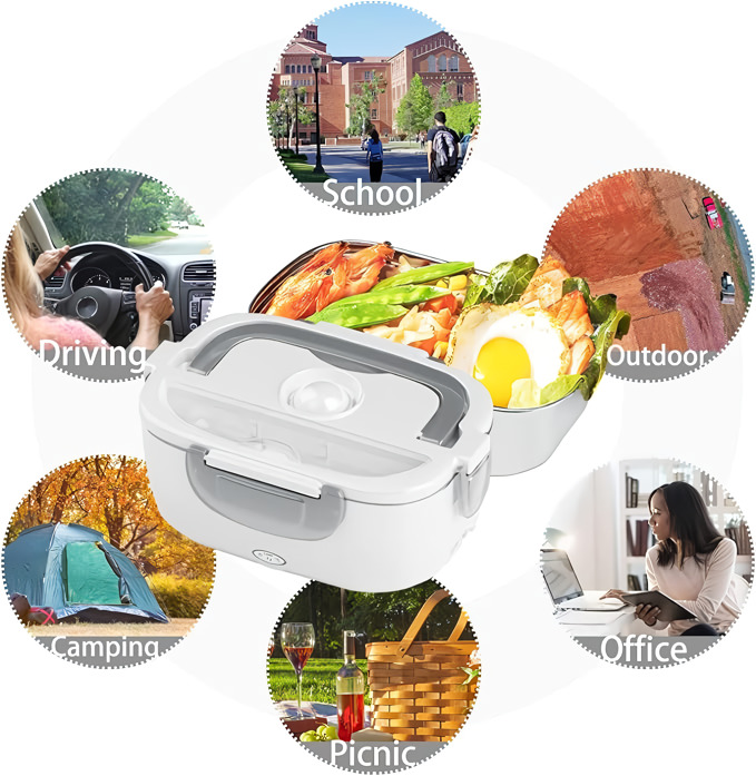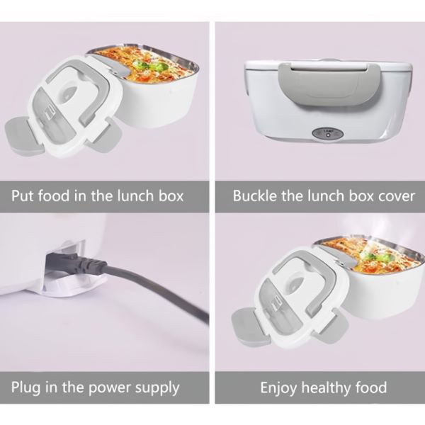 Cele 2 compartimente detașabile din PP îți mențin felul principal și garnitura separate – și ambele merg direct în mașina de spălat vase după. Funcționează la birou, în mașină, pe un șantier sau în orice cameră cu o priză electrică.
